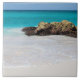 Ceramic tile with a beautiful photograph. A white sandy beach, with a gentle surf. Tropical turquoise water surrounds a jagged rock.