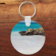 Keychain with a beautiful photograph. A white sandy beach, with a gentle surf. Tropical turquoise water surrounds a jagged rock.