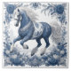 This ceramic tile features an azure steed, captured mid-stride in a dynamic pose against a crisp white backdrop. Intricate floral patterns adorn the horse's body, flowing mane, and tail, as well as its decorative saddle or harness. The artist subtly emphasizes the animal's muscles and movement. A detailed floral border in the same deep blue hue frames the scene. The symmetrical composition and slightly elevated perspective highlight the horse's posture. Muted colours and diffused lighting create a serene, vintage atmosphere reminiscent of classic tile artwork. This meticulously rendered design evokes a sense of classic beauty and artistry.
