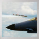 A squadron of World War II war bird fighter planes trail smoke in a salute to the Air Force B-1B Lancer Bomber of today, in this air show demonstration.