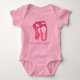 Baby suit design features an original marker illustration of a pair of pink ballerina pointe shoes, with B IS FOR BALLET in a fun font.