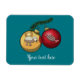 Boycott Christmas with this 'baa humbug' flexible photo magnet. Alternatively, make it a gift for the scrooge in your life. Featuring a cartoon of two baubles on a Christmas tree branch; one gold and shiny with a baaing sheep, the other red and sparkling with a humbug sweet, to make the phrase "baa humbug" in pictures. Change the default text beneath the Xmas decorations to your preferred message or caption.