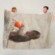 An adorable baboon baby sitting in the sand with an orange on this awesome fleece blanket.