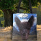 Knitting tote bag with all over print. A cute, chocolate brown alpaca face takes over the whole front of this lined tote bag. The Andes mountain range is also printed on the back. Personalize with black script at the top. Sample wording is, "Andrea's knitting project". This fun design features one of the camelids that supplies specialty yarn for fiber artists.