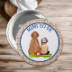 Brown and Blue personalised boy's Mimi to be button with a baby boy sitting next to a dog with a baseball theme.