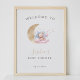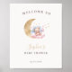 Welcome your lovely guests with this cute welcome sign featuring a watercolor illustration of a baby bear sitting on a pink and blue cloud with a gold moon and surrounded by stars, accompanied by elegant script typography. Customize them with your details and utilize the editing tools for further adjustments such as font size, placement, and color.