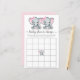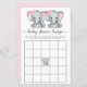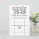 Cute twin baby girls bingo shower game featuring "baby shower bingo" in a stylish soft grey script with swashes and pastel pink watercolors of twin baby girl elephants.