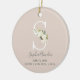 A beautiful baby birth stats birth record Christmas photo monogram ornament design. The front of the ornament features the letter S, decorated with white watercolor rose florals on a blush pink background, and baby's name in hand lettered script typography in soft gray, followed by baby's birth stats. The back of the card features baby's photo. Copyright Custom Photo Gifts, all rights reserved.