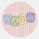 Baby Blocks Fun Stickers Seals with pink, white stripes background.
