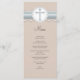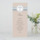 A lovely steel blue and tan colour scheme features faux pearl and cross design on this menu card for your religious celebration reception.