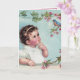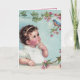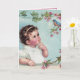 Small child intently gazes at Bluebird chirping on a flowering tree branch. Vintage design is pretty in soft aqua and pink colours.