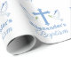 This elegant Baptism celebration gift wrapping paper features a soft, baby blue coloured cross. A beautiful white dove is placed on either side. A sample name is printed below the cross and doves, with the word "Baptism" printed beneath it. You can personalise the wrapping paper to include your own custom name or message. It makes a wonderful addition to the Baptism celebration for your baby boy.