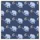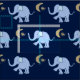 This beautiful fabric features a cute pattern of baby blue little elephants with a playfully lifted trunk and foot on midnight blue. The elephants gaze at golden yellow stars and moons.