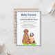Brown and Blue personalised boy's baby shower invitations with a baby boy sitting next to a dog with a baseball theme.