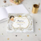 Beautiful baby boy in his christening suit and gold cross necklace. Background is white satin with a gold and silver glitter frame and bow embellishment. Back is adorned with gold ribbon on a white satin background.