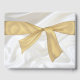Beautiful baby boy in his christening suit and gold cross necklace. Background is white satin with a gold and silver glitter frame and bow embellishment. Back is adorned with gold ribbon on a white satin background.