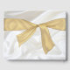 Beautiful baby in christening outfit. Background is white satin with a gold and silver glitter frame and bow embellishment. Back is adorned with gold ribbon on a white satin background.