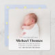 Announce your little one's arrival in style with this adorable baby boy announcement template! Featuring a modern, minimalist design, this card highlights a full-bleed photo layout and soft blue striped background with delicate periwinkle, yellow, and blue sky stars. The layout provides space for baby’s birth stats in a trendy, easy-to-read font, creating a timeless yet fresh aesthetic. Perfect for showcasing your baby boy’s first photos, this simple yet elegant card is a beautiful way to share your joy with family and friends. Customisable for a unique, personal touch!