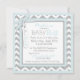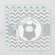 Sweet grey and white chevron print with baby blue accents and a polka dot print jumper with bow tie on clothesline and 3D-look bow and ribbon for a boy baby shower invitation card.