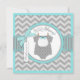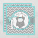 Sweet polka dot print jumper with bow tie on clothesline and 3D-look bow and ribbon for a boy baby shower invitation card. Colours are aquas and greys.