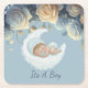 Baby Boy Celebration Square Paper Coaster peaceful sleeping baby in this charming invitation, perfect for welcoming your little prince. This design features a delicate watercolor illustration of a baby boy resting on a soft, fluffy cloud, framed by a lush arrangement of midnight blue and champagne gold roses.