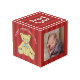 Create a precious keepsake in celebration of your baby's first Christmas. Replace the two sample photos with your own baby's photos and personalise with your baby's name, monogram initial and year of first Christmas. Front of cube has a sweet bear with a blue bow. Background is red on red stripes. Photography © Storytree Studios, Stanford, CA