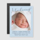 A simple pastel blue baby boy birth announcement magnet with your newborn's photo and his full name, arrival date and birth stats and family members in modern typography and "Introducing" written in a stylish script ending with a heart flourish.