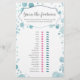 This baby shower game card features a script modern font on pastel blue transparent dots background, perfect for a baby boy! Please check all games from this collection below.