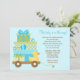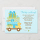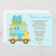 This cute Baby Shower invitation features blue baby gifts and a rubber ducky in a wagon. This modern and fun baby shower invitation is perfect for any mum to be.