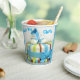 Adorable and special baby boy paper cups, designed with a round cake with yellow, brown, and blue stripes on white frosting. Blue ribbon around cake with bow! On top of cake has blue and white baby shoes, with baby boy, Chris. Ready to serve, a real time saver! See store for matching themed!