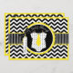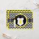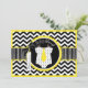 Black and white chevron print with yellow accents and a polka dot jumper with a yellow tie and 3D-look bow and ribbon for a boy baby shower invitation card.