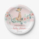 Cute design for Baby Shower paper plates features cute baby giraffe on eucalyptus greenery swing mixed blush pink roses.