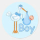 Unique Baby Shower Gifts for the New Mum or Mum to be. Baby Onsies, invitations,post cards, keyrings, magnets, button party favours, keepsake mugs and more. Each Item can be personalised with names and dates. This Design Features a Stork with a baby boy.