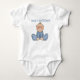 A baby boy in a blue blanket sleeper and blue text that reads "Baby Sister" on Baby Sister tote bags, Tshirts and other items.