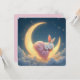 A fluffy white rabbit is cosily wrapped in a pink blanket, resting peacefully on a glowing crescent moon in a dreamy night sky.