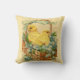An Easter pillow showing baby chicks sitting in an Easter basket filled with blue flowers and tied with blue ribbon on top.