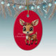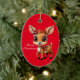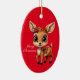 Celebrate the holiday season with this red festive oval ceramic ornament featuring an endearing woodland forest animal cartoon graphic of a cute baby deer with poinsettia flowers tucked in the fawn's ear, and Merry Christmas written in white. Perfect for decorating your tree or as a thoughtful gift, this whimsical floral doe decor makes a cherished keepsake for years to come. Customise by changing the text, the font, the font colour, or remove the text. You can even transfer this design onto other products. Enjoy this design your way! Check out ForestBabies Xmas Deer Collection for matching decorations. 🎄🦌