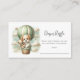 Adventure themed baby shower baby "Diaper Raffle" enclosure card with an adorable white and tan puppy holding a teddy bear riding in a green hot air balloon. The watercolor green sky has white clouds with surrounding gold stars. A diaper outline on back.