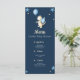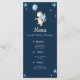 Very cute menu cards for your Baby Shower celebration. The simple design, not too crowded with images, make it relaxing to look at. The illustration has a little dragon with blue wings holding a blue balloon. Some other accents are stars and dots. Personalize all the text in the menu with your own information. Very easy to do! Illustrated and designed by Patricia Alvarez.