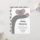 A baby shower invitation with a smiling, grey, elephant character. The baby elephant is standing on the trunk of a parent elephant. The back of the invitation shows a pattern of elephants. All of the words can be customised.