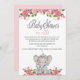 Baby girl baby shower by mail invitation with an adorable pink princess elephant wearing a silver tiara and surrounded by pink flowers. Contact us for help with customisation or to request matching products.