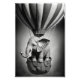 Playful baby elephant taking a ride in a hot air balloon. The whimsical image is set against a dreamy background, creating a sense of adventure and wonder. The unique combination of an elephant and hot air balloon is sure to add a touch of whimsy and fun.