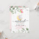Unique virtual girl baby shower invitation featuring a watercolor baby elephant, moon, balloons, and tree leaves