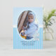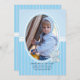 A sweet juvenile photo invitation with blue and grey stripes, an oval photo window and a little elephant motif.