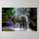 A photographic print of a baby elephant in the zoo playing under a waterfall.