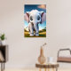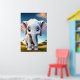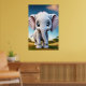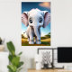 Poster of a cute, animated baby elephant with large, expressive eyes standing in a grassy field under a bright sky. The elephant has a joyful expression, adorned with soft, pastel colours that enhance its playful nature.
