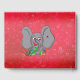 Cute cartoon blue baby elephant with a heart on the ear and grass and flower over a red background with small white hearts