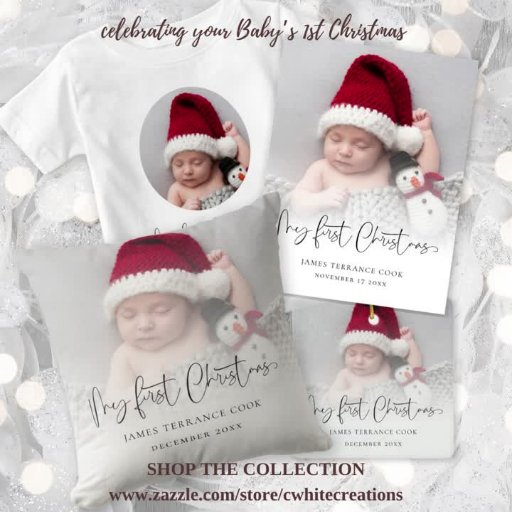 Baby First Christmas Birth Date Photo Text Overlay. Send the joyful news of your baby's arrival along with your festive wishes. Replace the sample image with your own favourite. My First Christmas is in a stylish set script and easily personalise with baby's name, date of birth and your greeting inside.