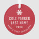 This stylish two-sided holiday photo keepsake ornament features a newborn photo framed by a rich red and white striped background pattern. The back of the ornament includes "My First Christmas" wording with snowflake accent and custom text for the baby's full name and the year.