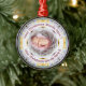 Pretty Circular Baby Girl Boy First Christmas Photo Gift Hanging Ornament. In autumn and winter colors of yellow, purple, and blue. A muted, round border surrounds the picture in the middle. Replace the photo with a picture of your own beautiful new baby boy or girl, or child. The text at the top says “Your Christmas Words Here 1” in pink. At the bottom are the words “Your Christmas Words Here 2”, in pink. Personalize this by changing the words and picture. Give as a present for a new mum at Christmas. Mama, mom, mam, mammy, mommy, mother, and your wife will love hanging up this gift decoration to celebrate the birth of their new baby and their first Christmas. In lovely, pastel and bold colours.
